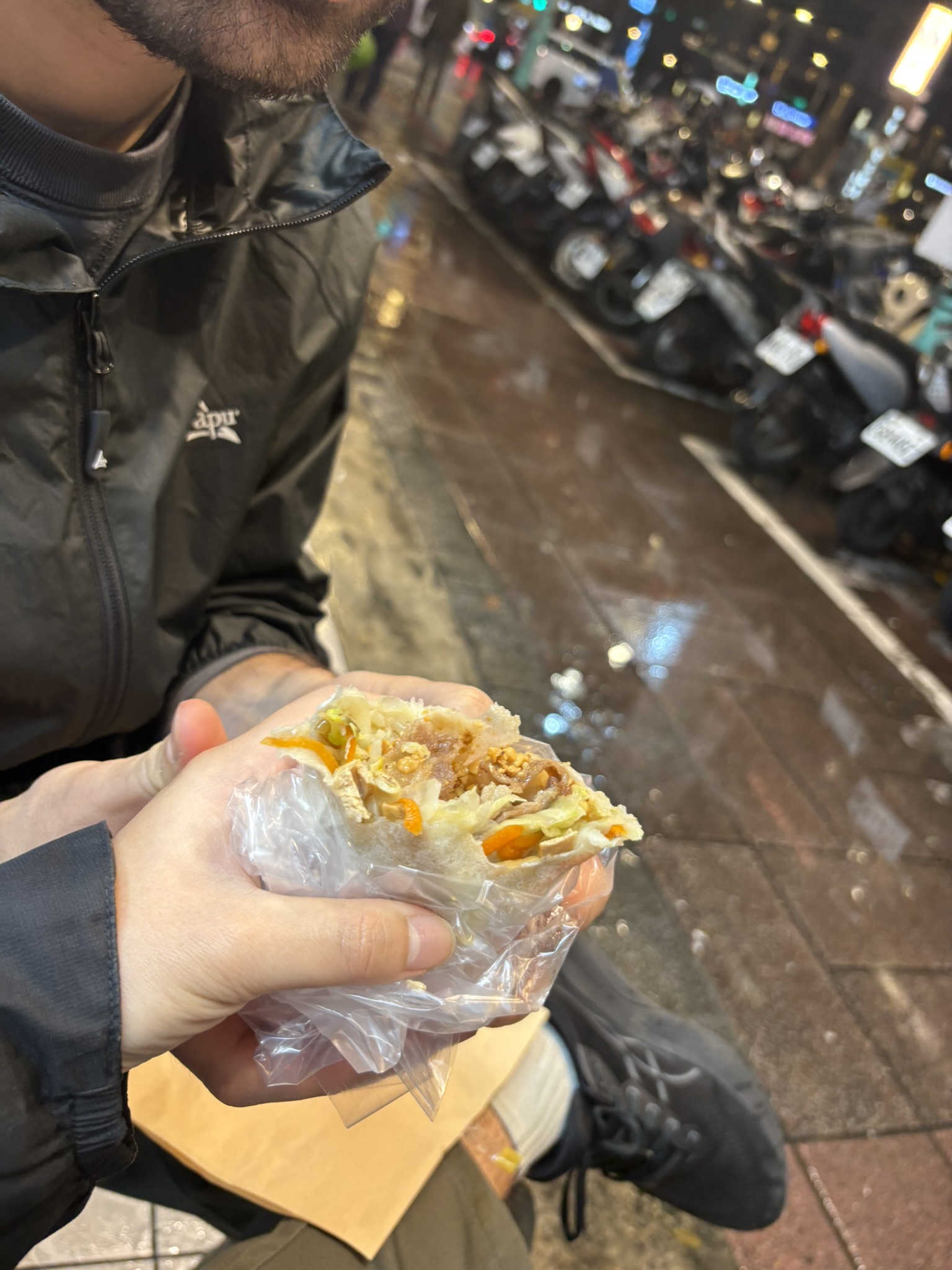 - Stinky tofu with duck blood (opposite the tomato stall) — a very Taiwanese taste. Go here if you want an original taiwanese taste. I thought a sewer had burst open, it turns out it was the tofu... It might stink but it tastes good.